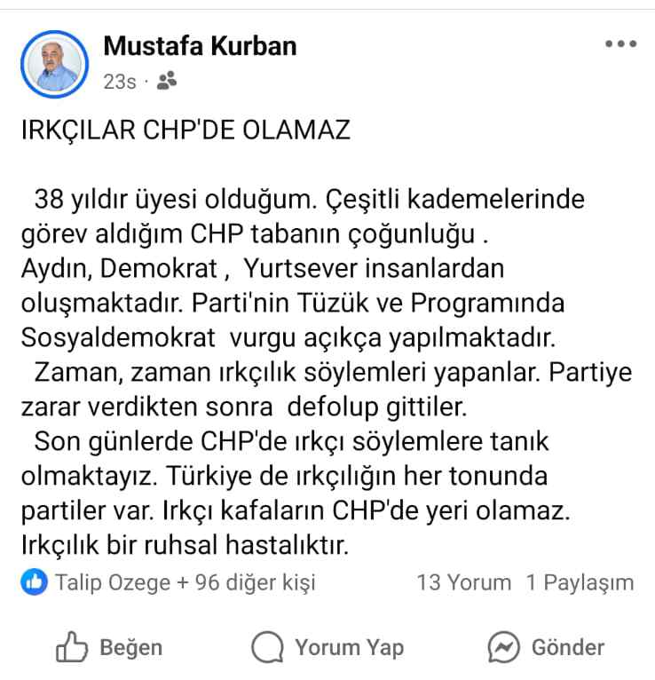 30 yılı aşkındır kesintisiz şekilde kurultay delegesi olan eski CHP Bingöl İl Başkanı Mustafa Kurban, partide ortaya çıkan ırkçı eğilimlere sosyal medya hesabından tepki gösterdi.