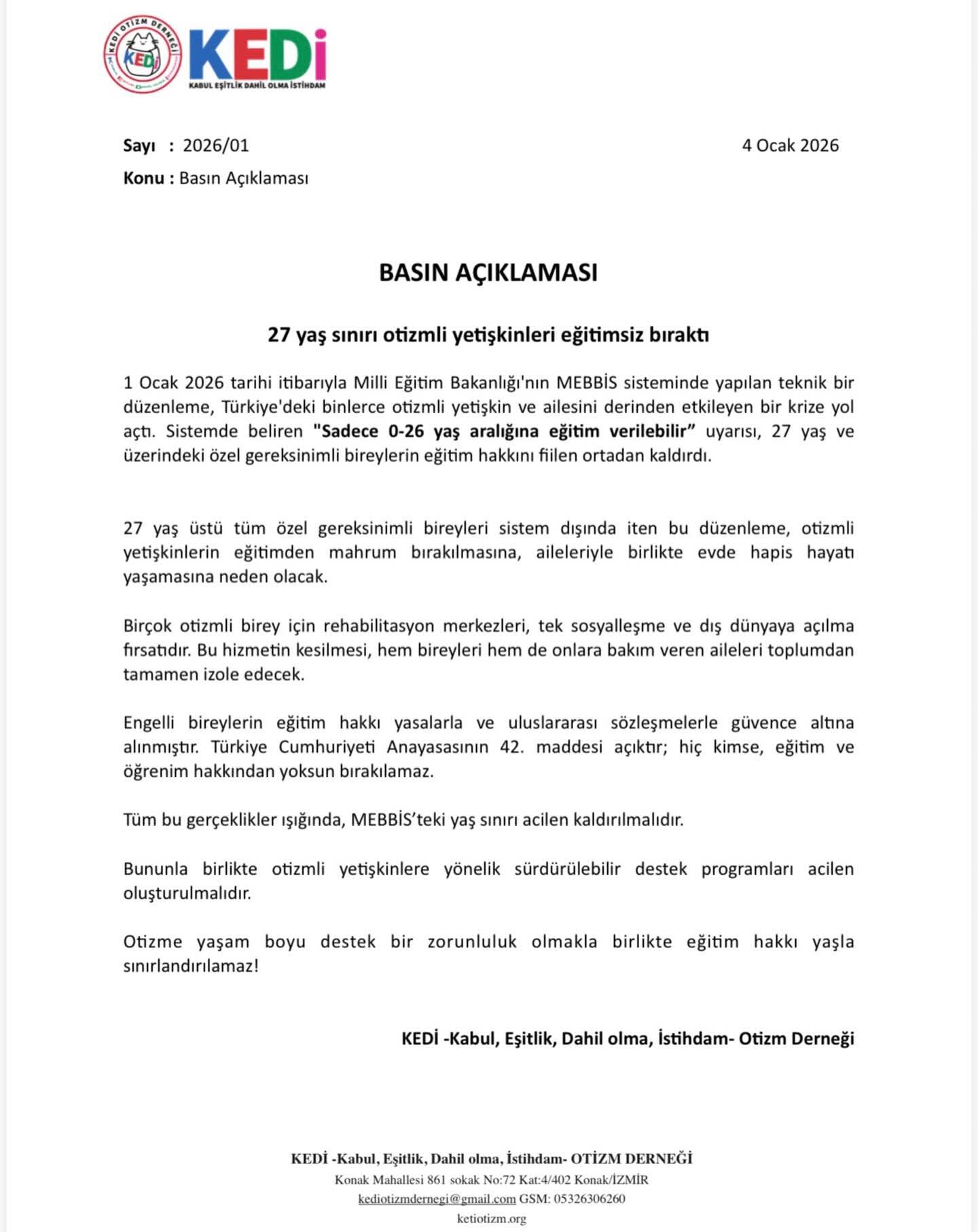 Yapılan açıklamada; ” 1 Ocak 2026 tarihi itibarıyla Milli Eğitim Bakanlığı’nın MEBBİS sisteminde yapılan teknik bir düzenleme, Türkiye’deki binlerce otizmli yetişkin ve ailesini derinden etkileyen bir krize yol açtı. Sistemde beliren “Sadece 0-26 yaş aralığına eğitim verilebilir” uyarısı, 27 yaş ve üzerindeki özel gereksinimli bireylerin eğitim hakkını fiilen ortadan kaldırdı” vurgusu yapıldı.