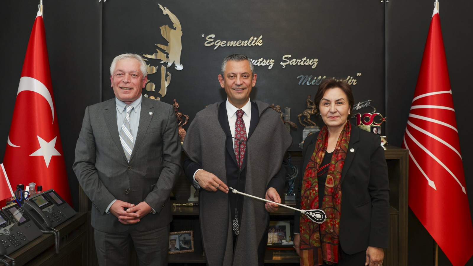 Ziyarette Özgür Özel’e geleneksel Çerkes kamçısı ve geleneksel Çerkes kıyafeti olan ‘Şharkon’ da hediye edildi.