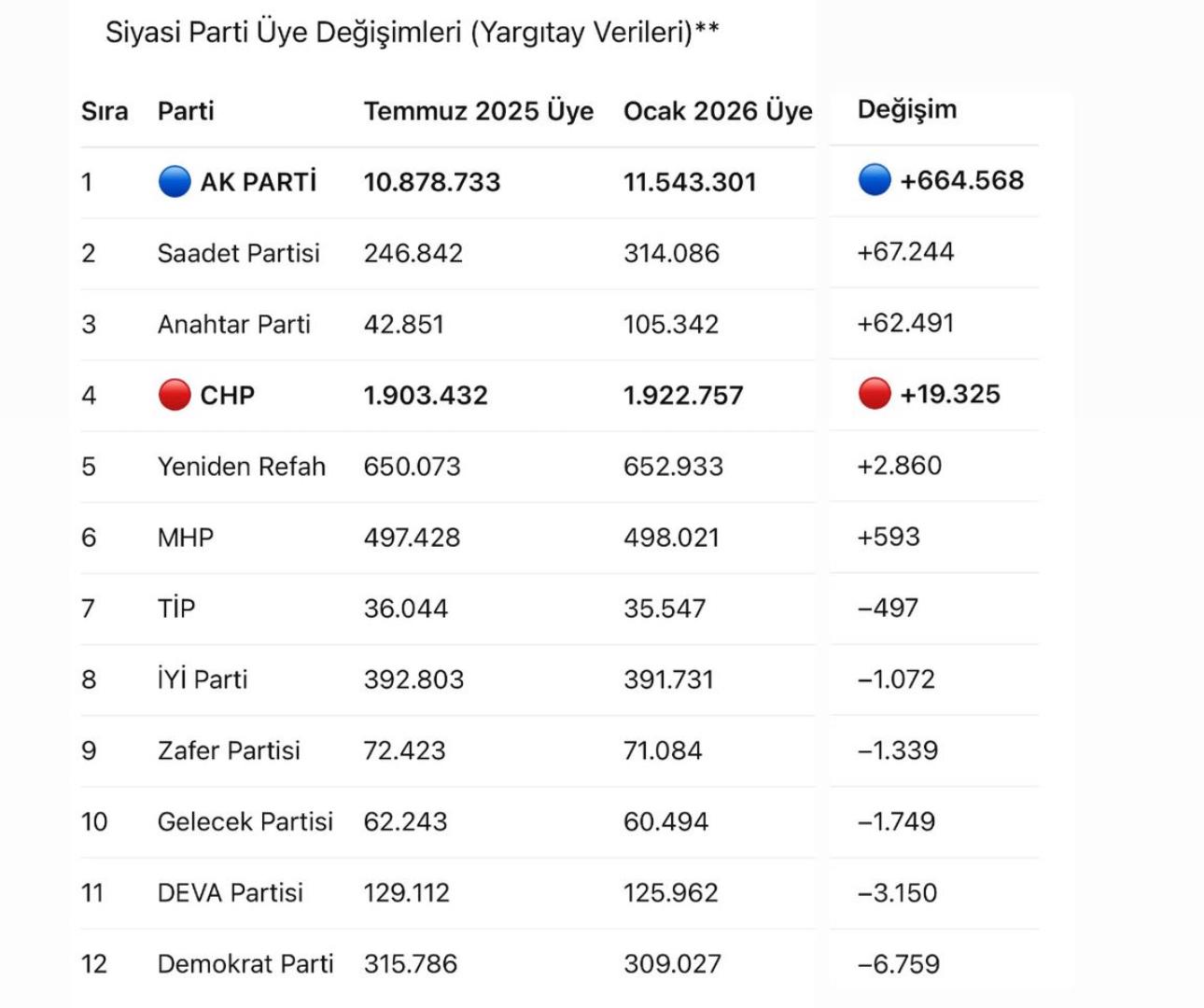 Aşağıdaki tablo, siyasi partilerin yalnızca altı ay içinde üye sayılarında yaşanan değişimi bütün açıklığıyla ortaya koymaktadır: