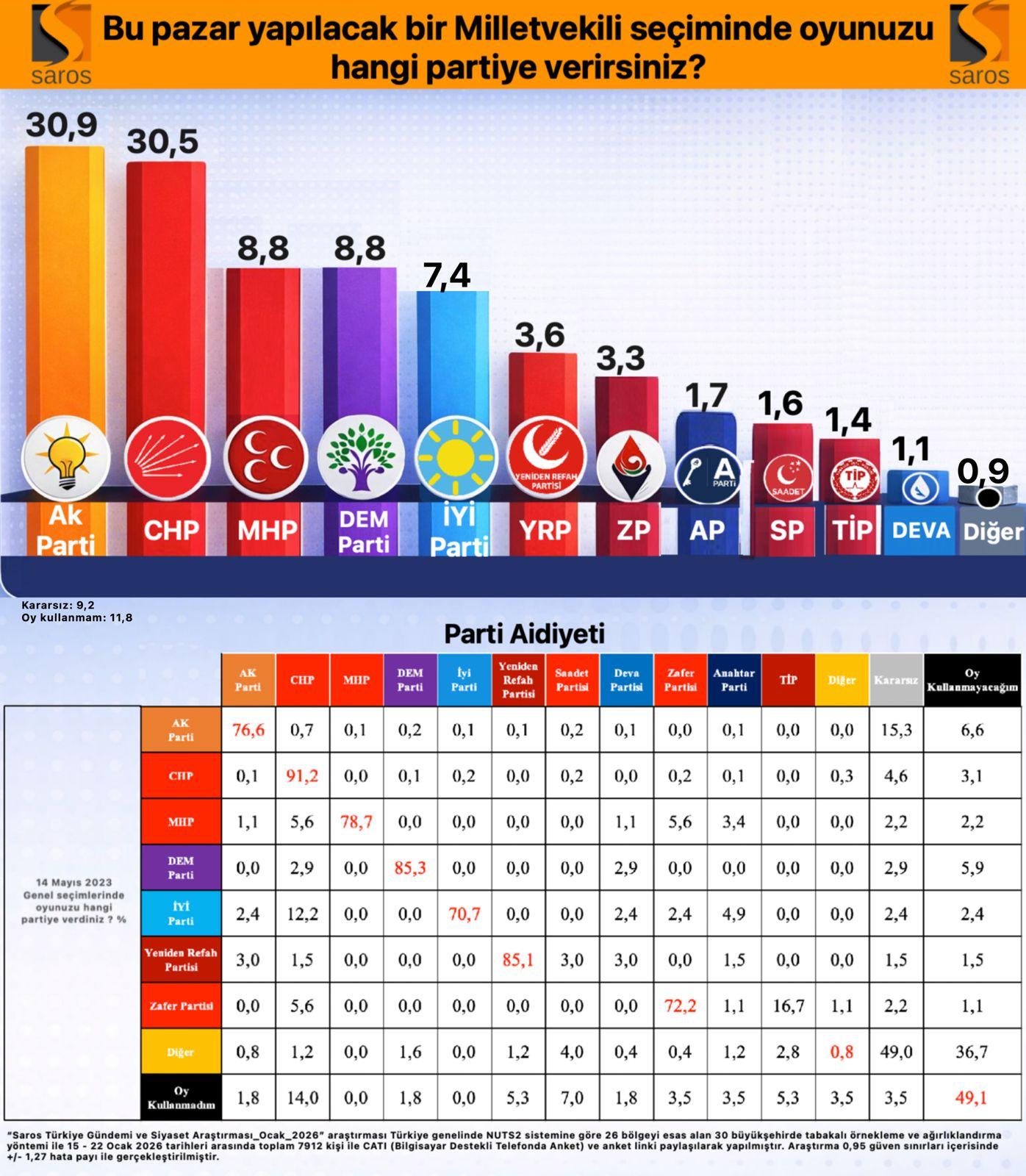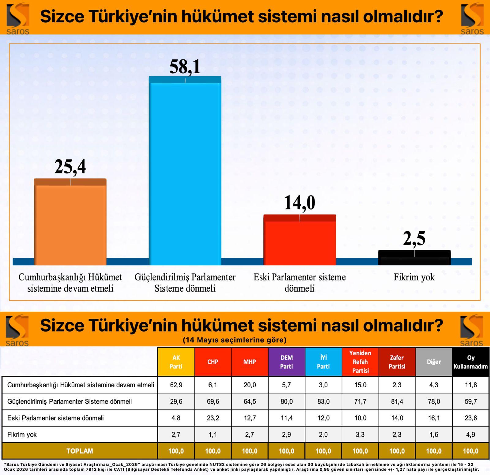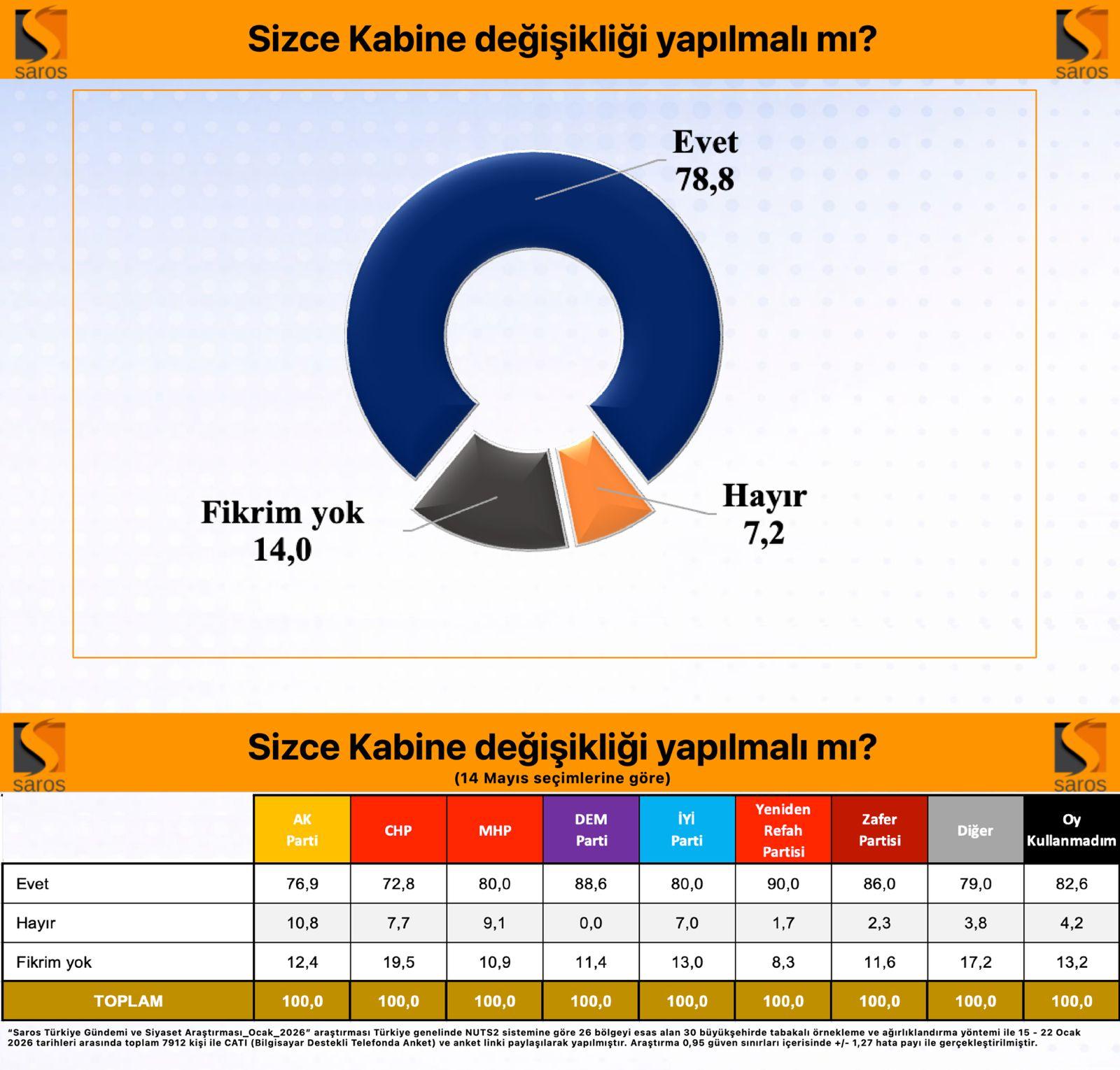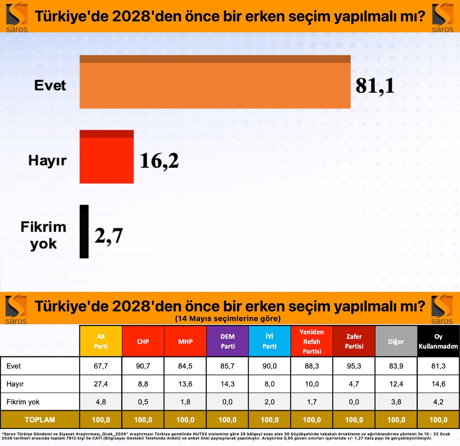 “Saros Türkiye Gündemi ve Siyaset Araştırması / Ocak2026” araştırması Türkiye genelinde NUTS2 sistemine göre 26 bölgeyi esas alan 30 büyükşehirde tabakalı örnekleme ve ağırlıklandırma yöntemi ile 15 – 22 Ocak 2026 tarihleri arasında toplam 7912 kişi ile CATI (Bilgisayar Destekli Telefonda Anket) ve anket linki paylaşılarak yapılmıştır. Araştırma 0,95 güven sınırları içerisinde +/- 1,27 hata payı ile gerçekleştirilmiştir.