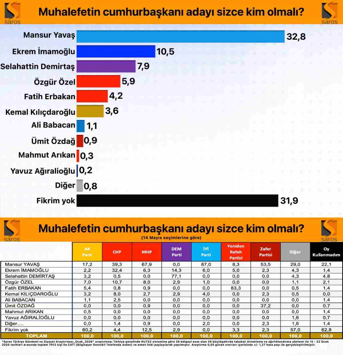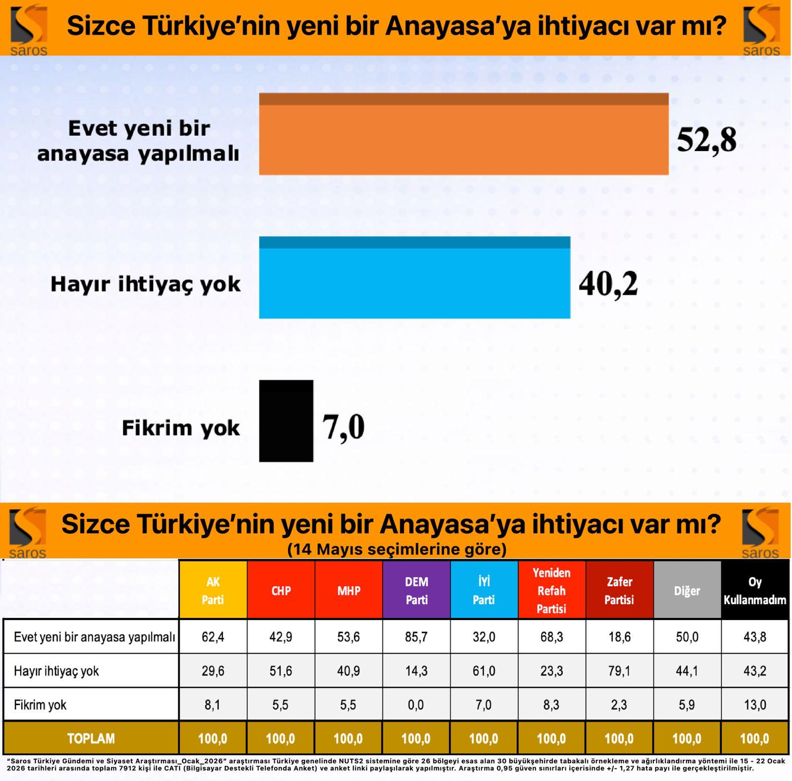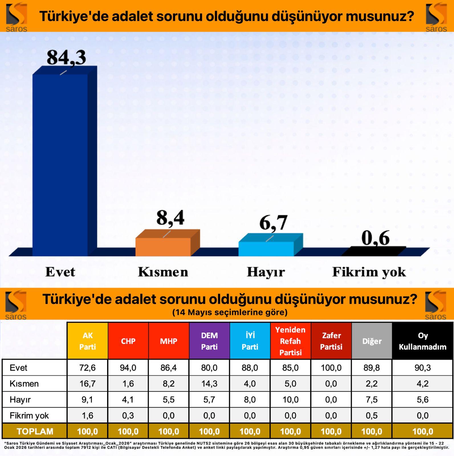 “Saros Türkiye Gündemi ve Siyaset Araştırması / Ocak2026” araştırması Türkiye genelinde NUTS2 sistemine göre 26 bölgeyi esas alan 30 büyükşehirde tabakalı örnekleme ve ağırlıklandırma yöntemi ile 15 – 22 Ocak 2026 tarihleri arasında toplam 7912 kişi ile CATI (Bilgisayar Destekli Telefonda Anket) ve anket linki paylaşılarak yapılmıştır. Araştırma 0,95 güven sınırları içerisinde +/- 1,27 hata payı ile gerçekleştirilmiştir.