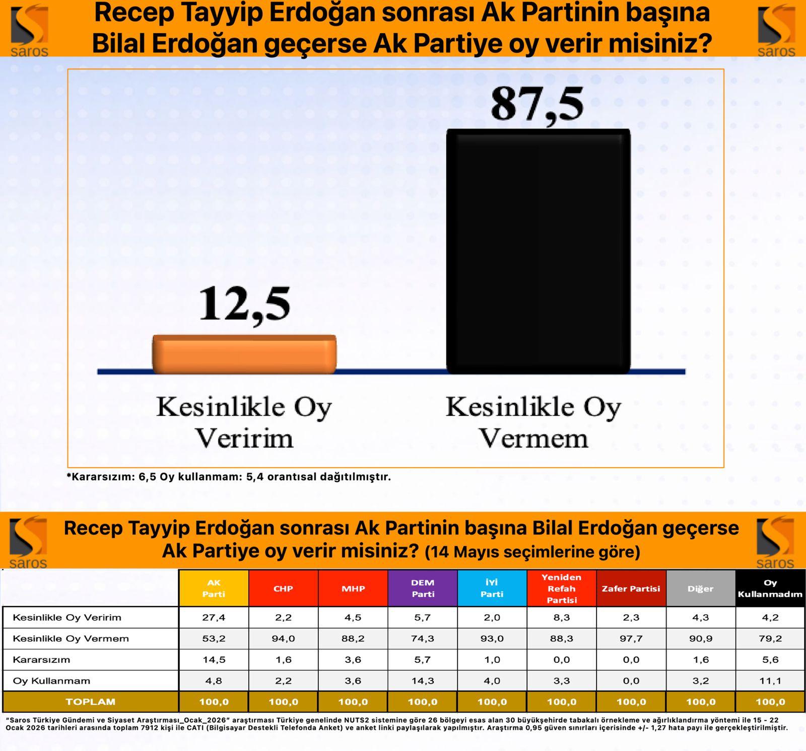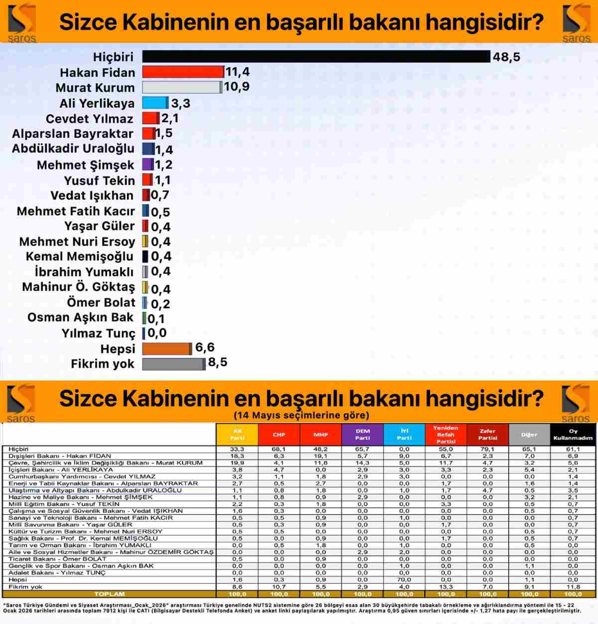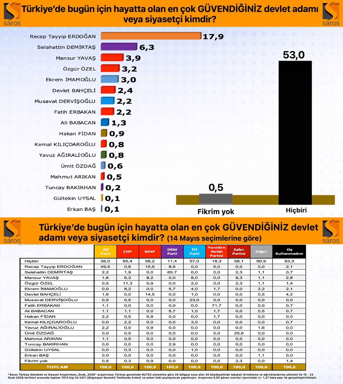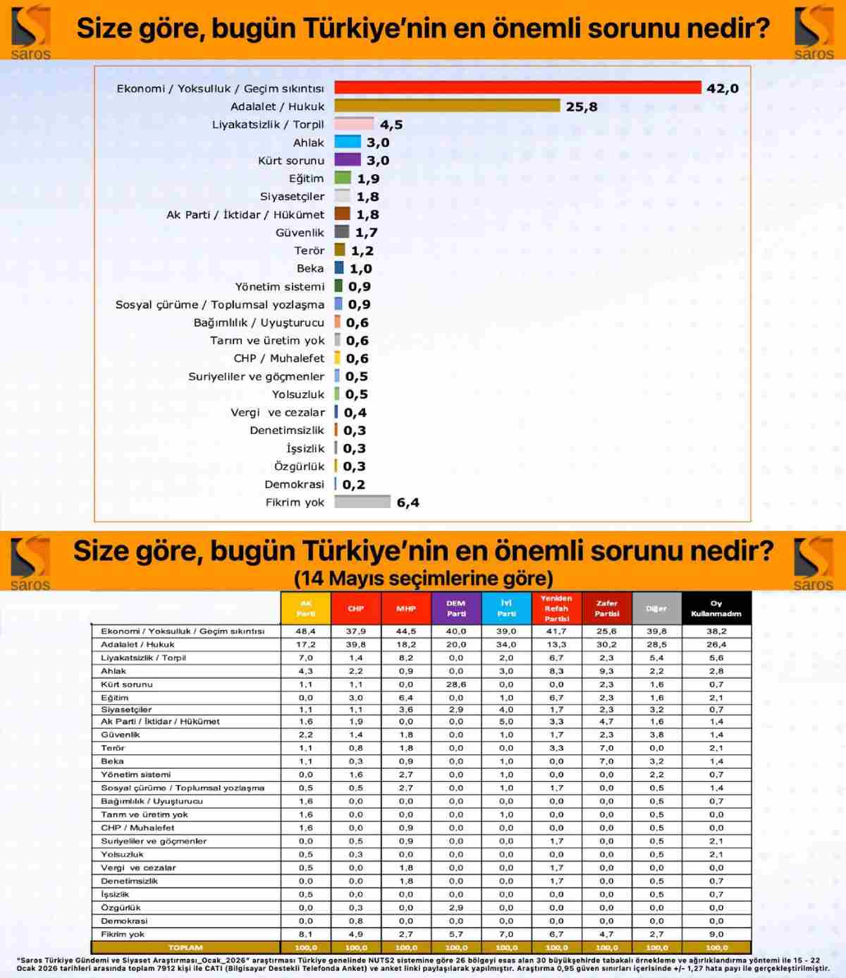 “Saros Türkiye Gündemi ve Siyaset Araştırması / Ocak2026” araştırması Türkiye genelinde NUTS2 sistemine göre 26 bölgeyi esas alan 30 büyükşehirde tabakalı örnekleme ve ağırlıklandırma yöntemi ile 15 – 22 Ocak 2026 tarihleri arasında toplam 7912 kişi ile CATI (Bilgisayar Destekli Telefonda Anket) ve anket linki paylaşılarak yapılmıştır. Araştırma 0,95 güven sınırları içerisinde +/- 1,27 hata payı ile gerçekleştirilmiştir.