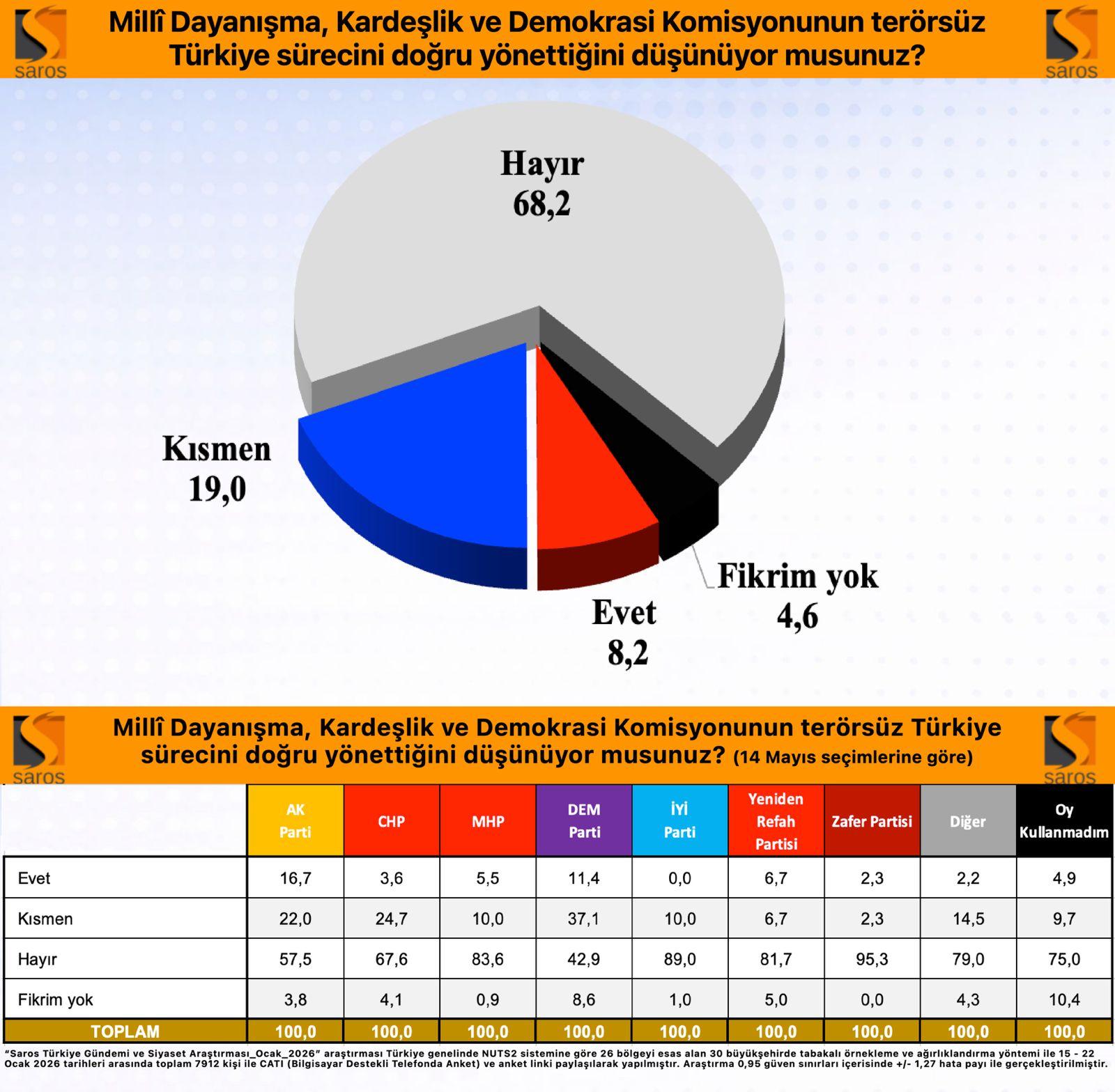 “Millî Dayanışma, Kardeşlik ve Demokrasi Komisyonunun terörsüz Türkiye sürecini doğru yönettiğini düşünüyor musunuz?” sorusuna ankete katılanların %68.2’si ‘Hayır’ yanıtını verirken doğru yönetildiğini düşünenlerin oranı ise sadece %8.2’de kaldı. Kısmen doğru bulanların oranı ise %19.0 oldu.